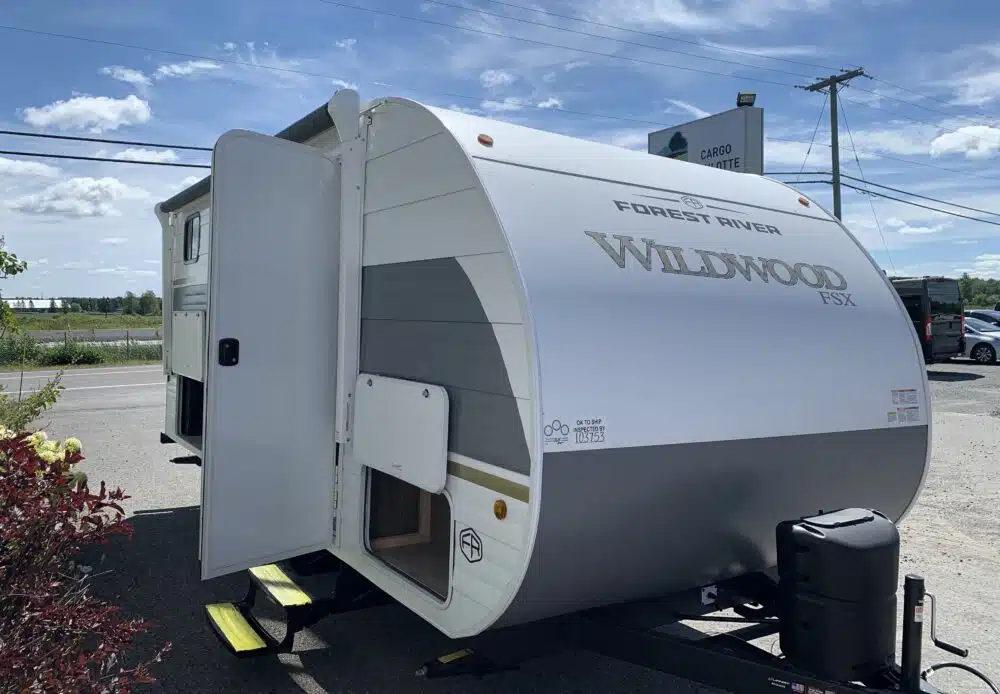 D’abord, cette roulotte a un auvent de 14 pieds et une douche pour profiterez de l’extérieur sans soucis. Puisque ses marches sont ajustables et très stables vous aurez un accès facile à l’intérieur. Les coffres ont un bel espace de rangement.