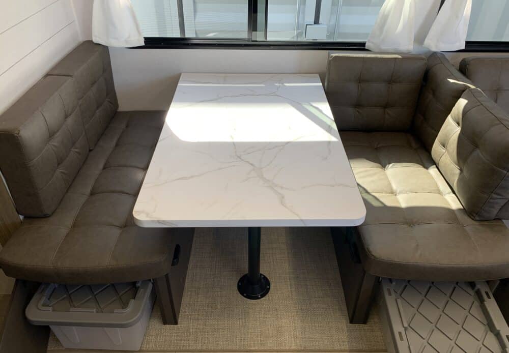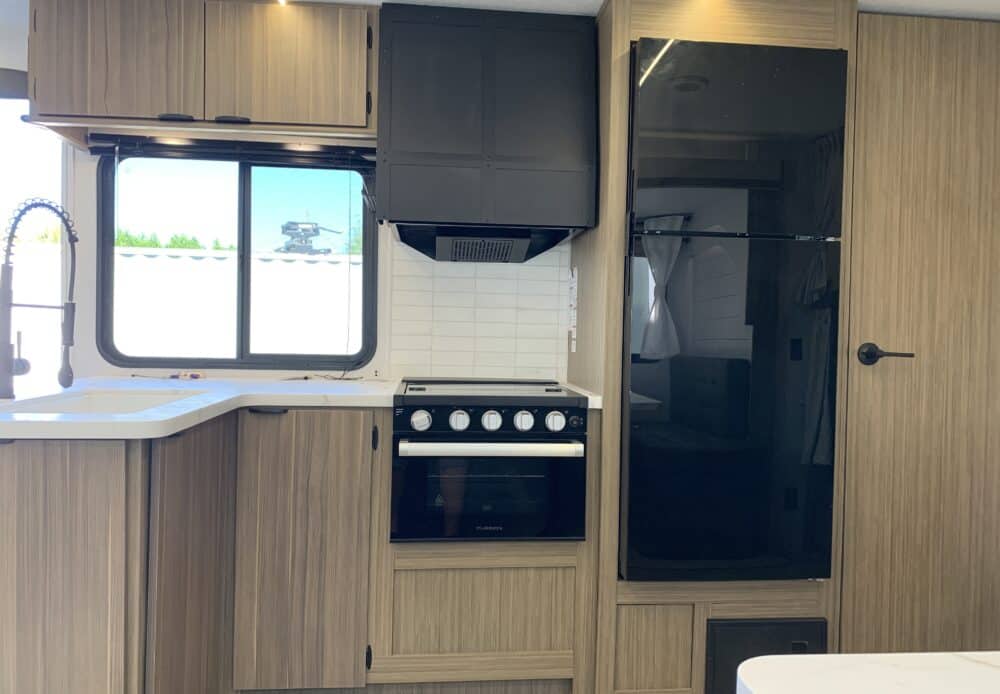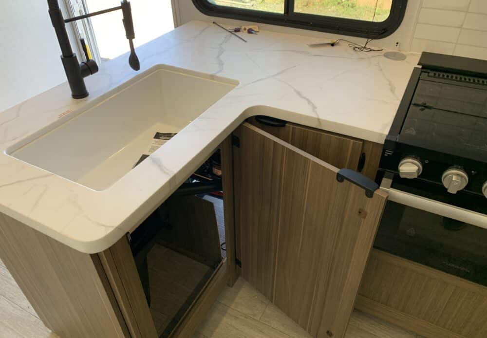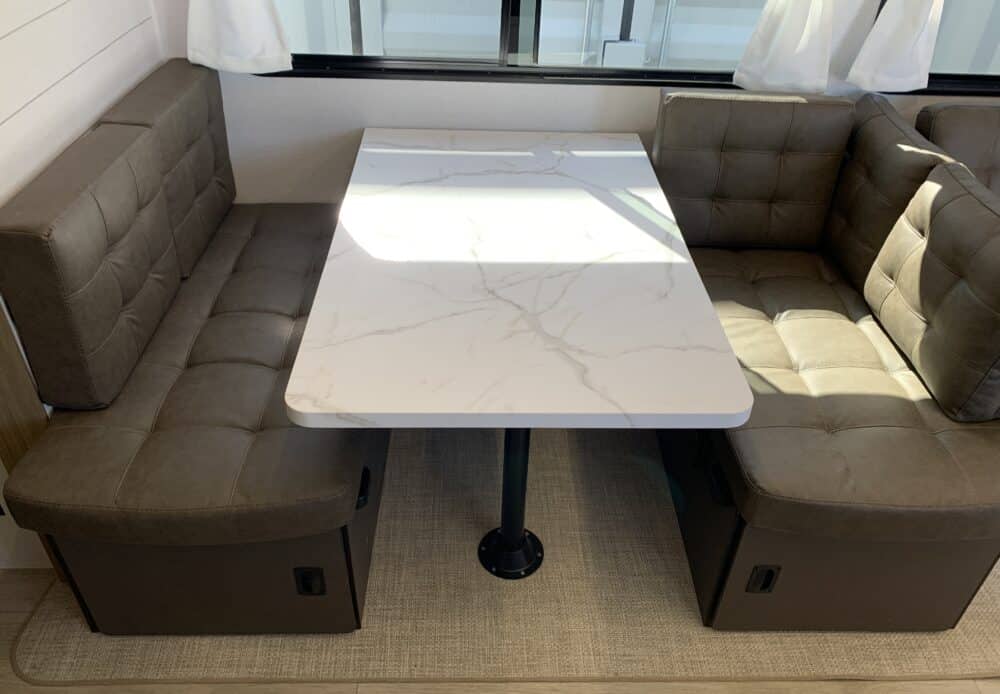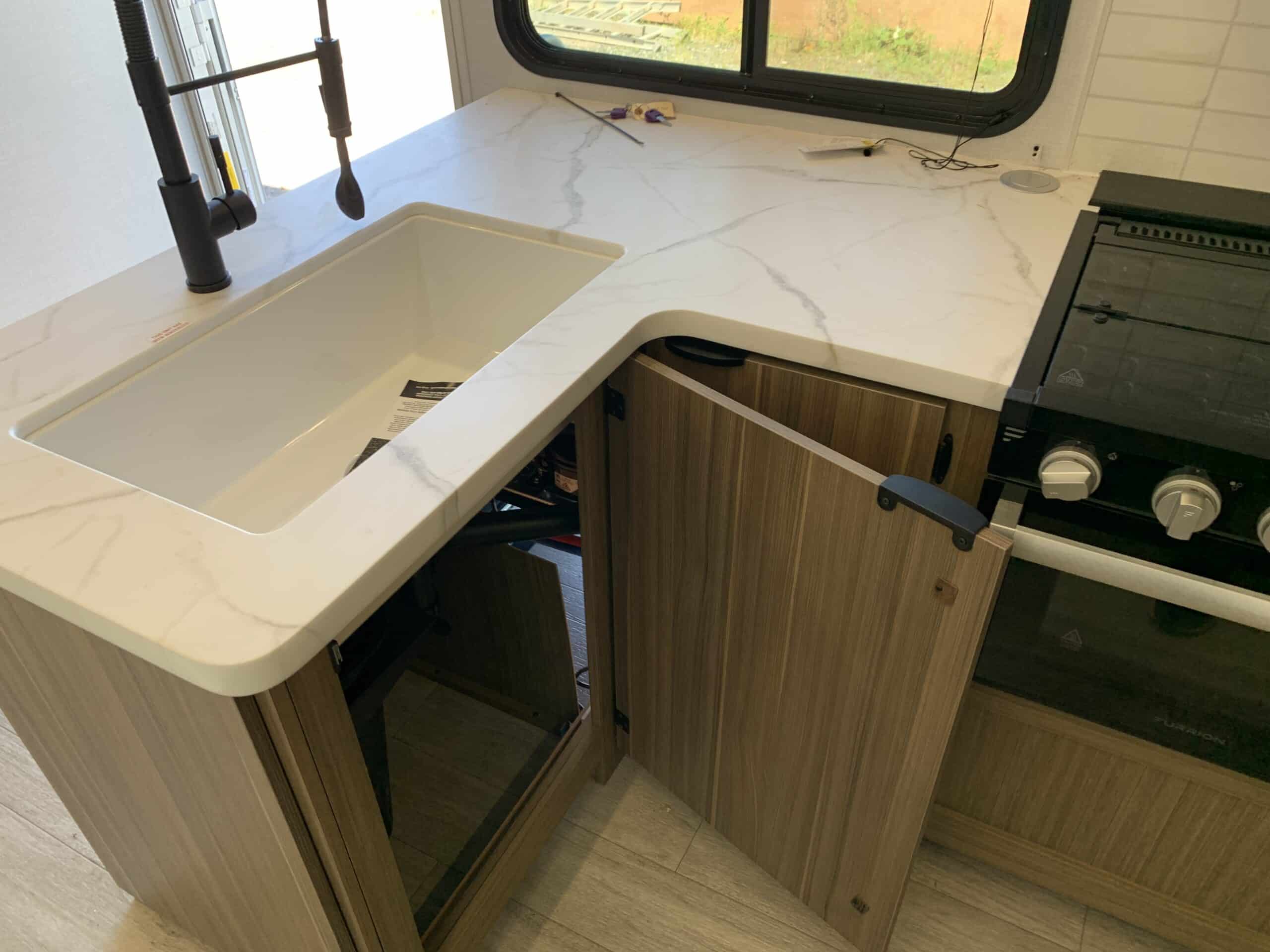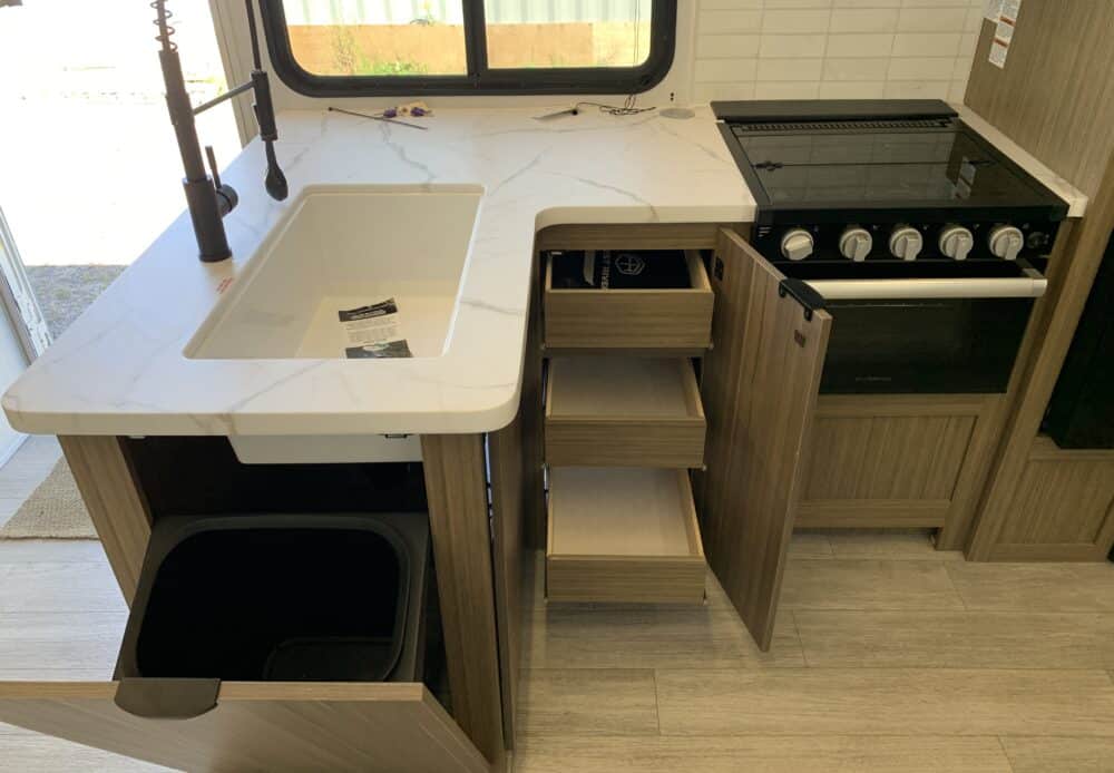D’abord, cette roulotte a un auvent de 18 pieds, une douche et une cuisine pour profiterez de l’extérieur sans soucis. Puisque ses marches sont ajustables et très stables vous aurez un accès facile à l’intérieur. Les coffres ont un bel espace de rangement.