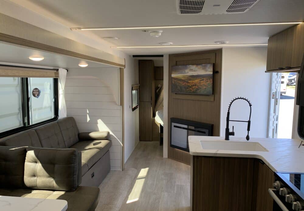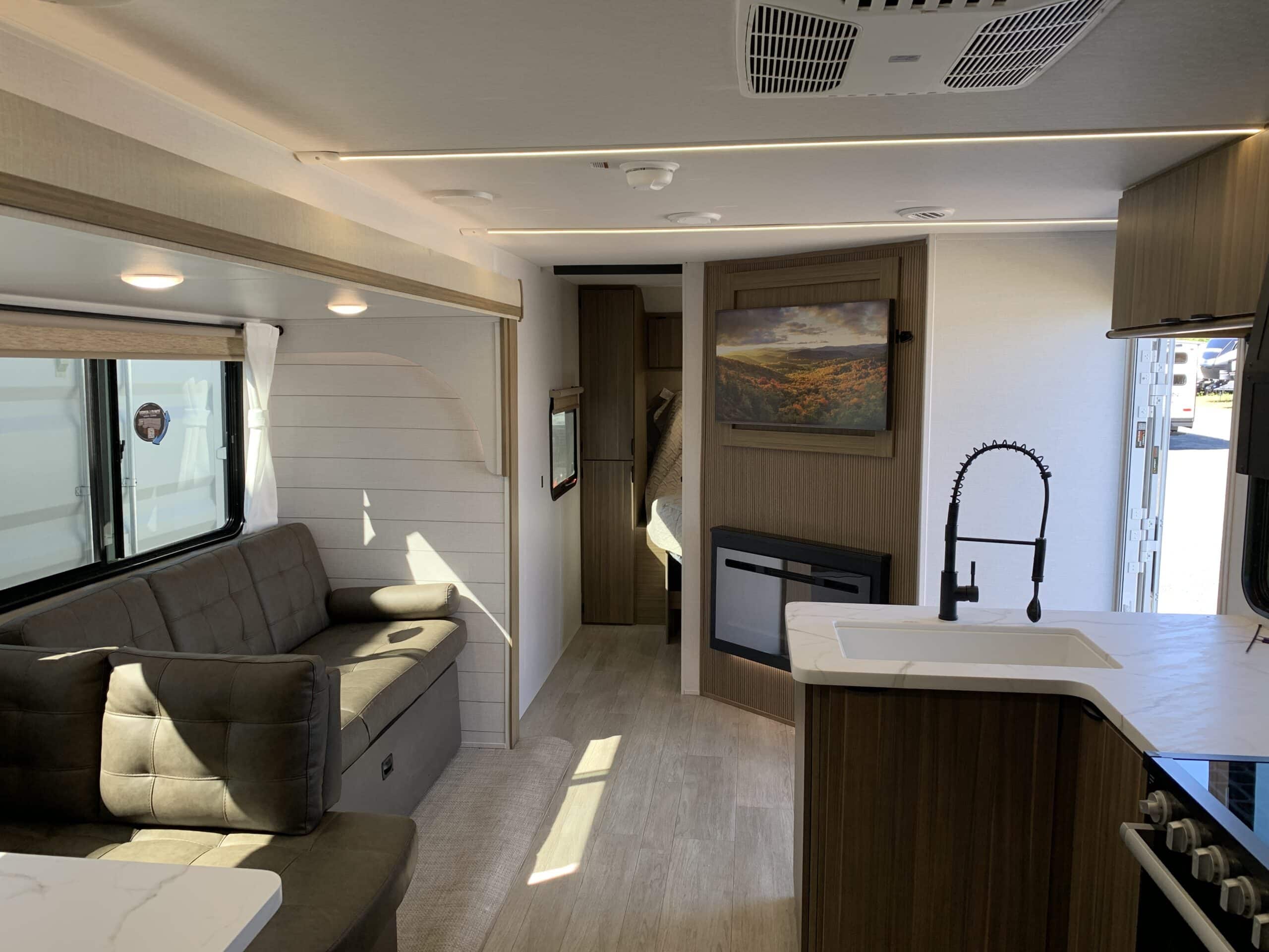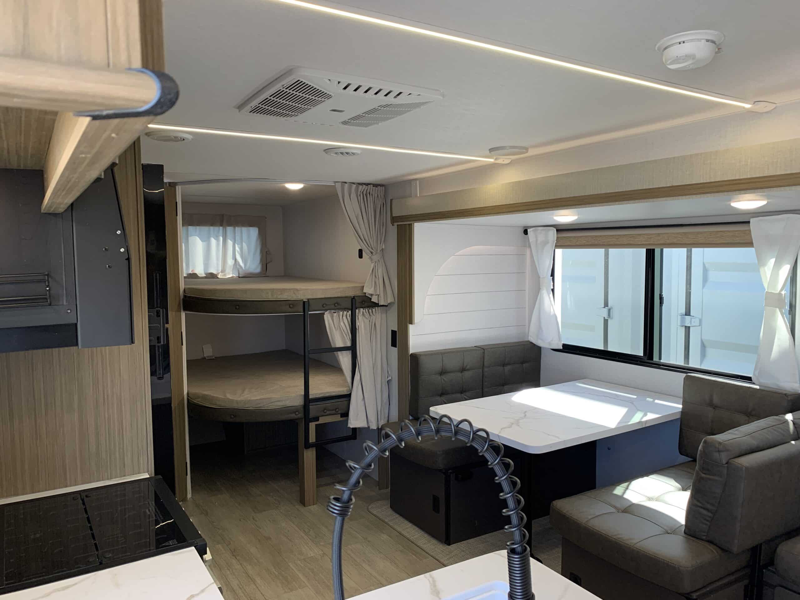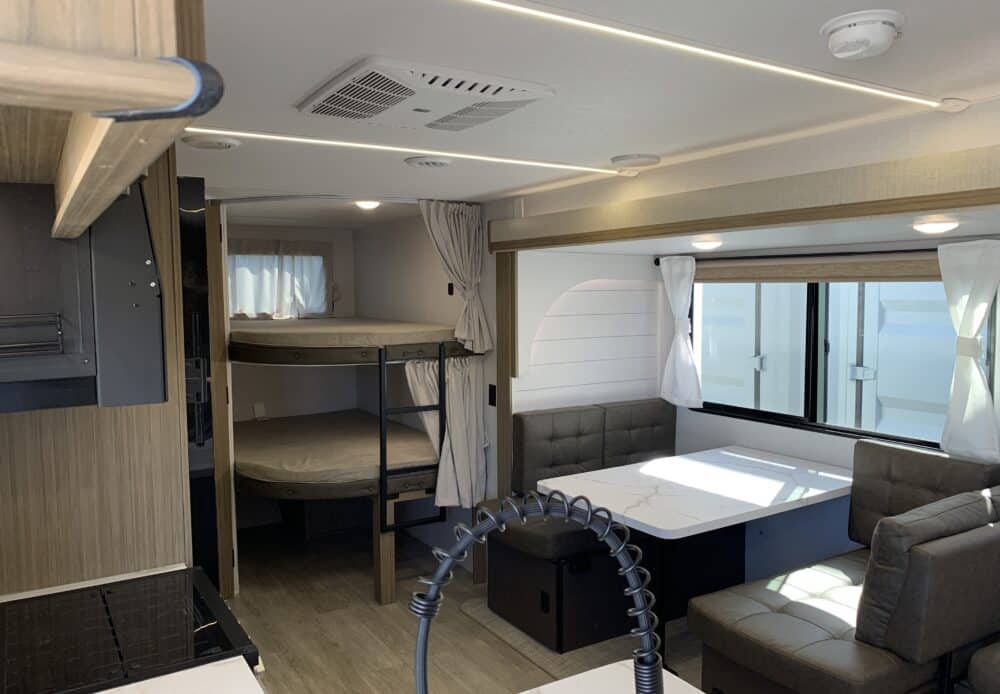 La Wildwood 26DBUD a un air climatisé de 13500 btu qui tempérera l’ambiance désirée. Par ailleurs, la cuisinière a un four et 3 brûleurs, un réfrigérateur 12 volts et un micro-ondes. De plus, il y a une banquette versatile, ainsi qu’un sofa en L. Enfin, le système audio vous permettra d’écouter votre musique préférée.