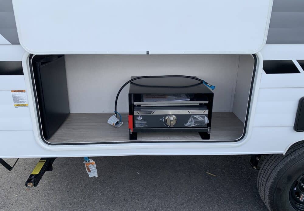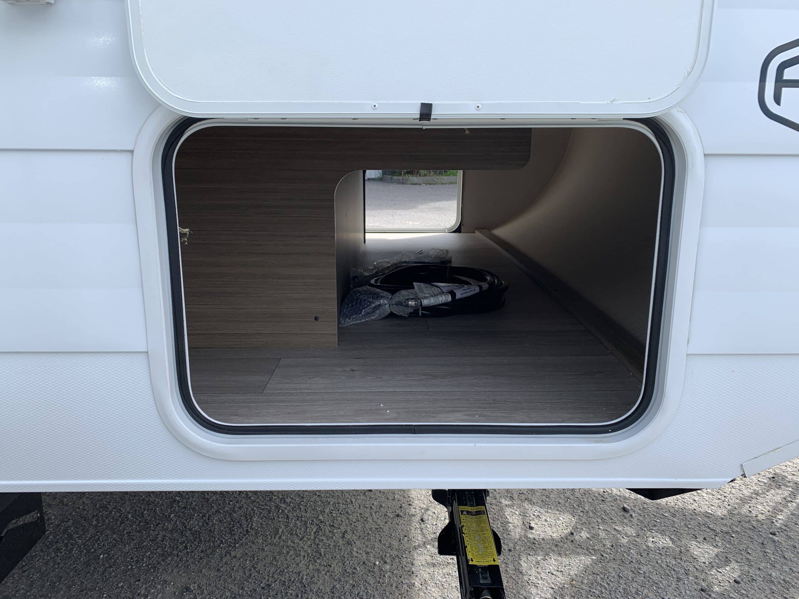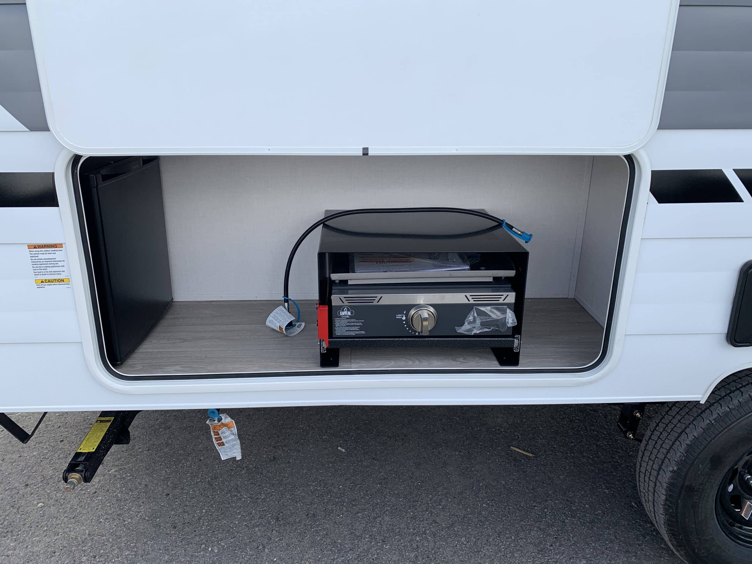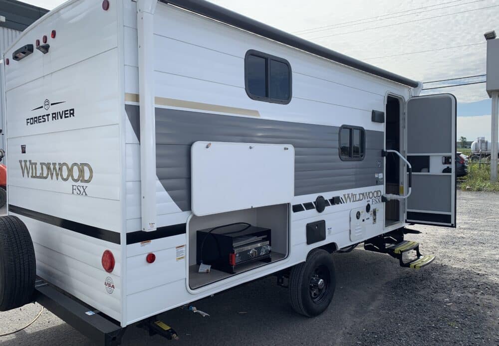 D’abord, cette roulotte a un auvent de 12 pieds, une douche et une cuisine pour profiterez de l’extérieur sans soucis. Puisque ses marches sont ajustables et très stables vous aurez un accès facile à l’intérieur. Les coffres ont un bel espace de rangement.