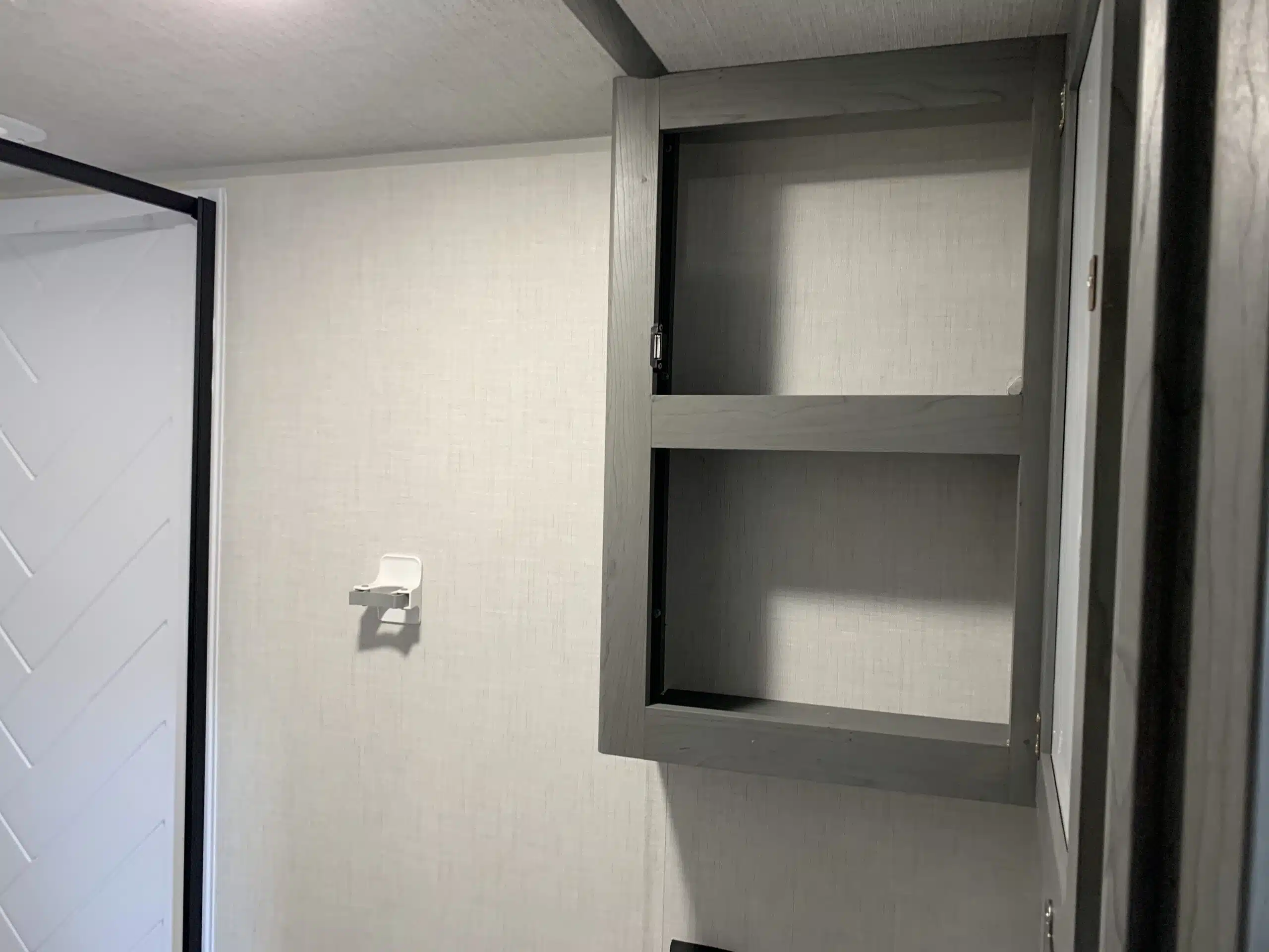 Un lit queen avec armoires au-dessus et une penderie complète l’aménagement.