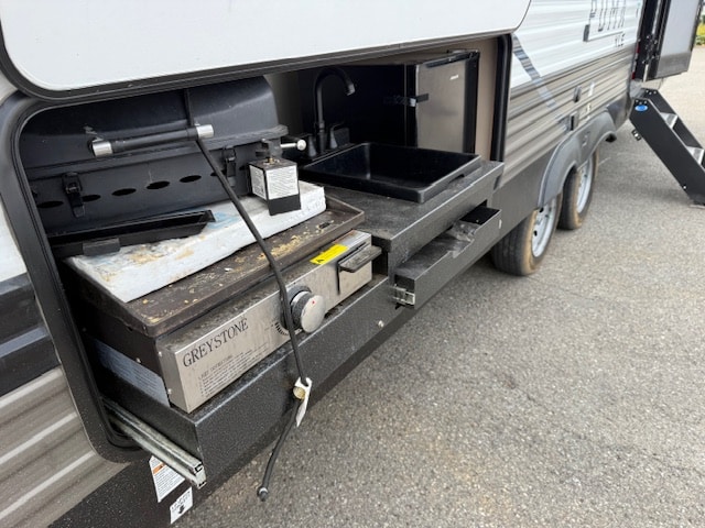 D’abord, cette roulotte a un auvent de 19 pieds et une cuisine pour profiterez de l’extérieur sans soucis. Les coffres ont un bel espace de rangement.