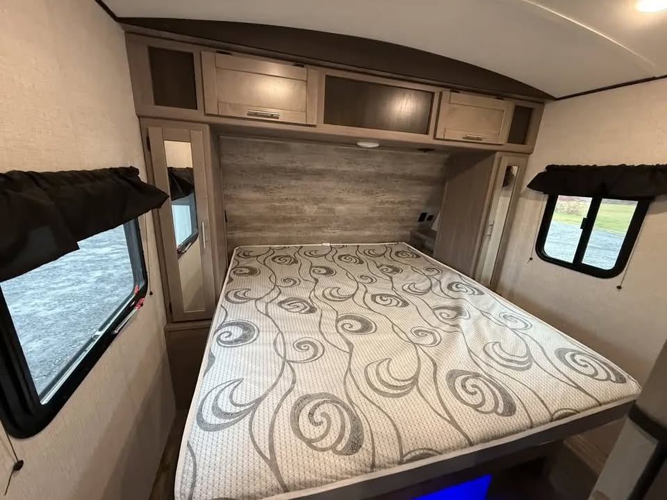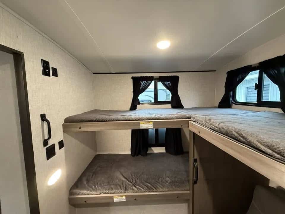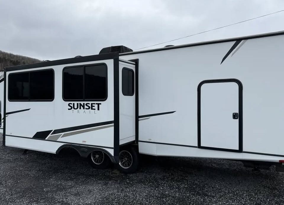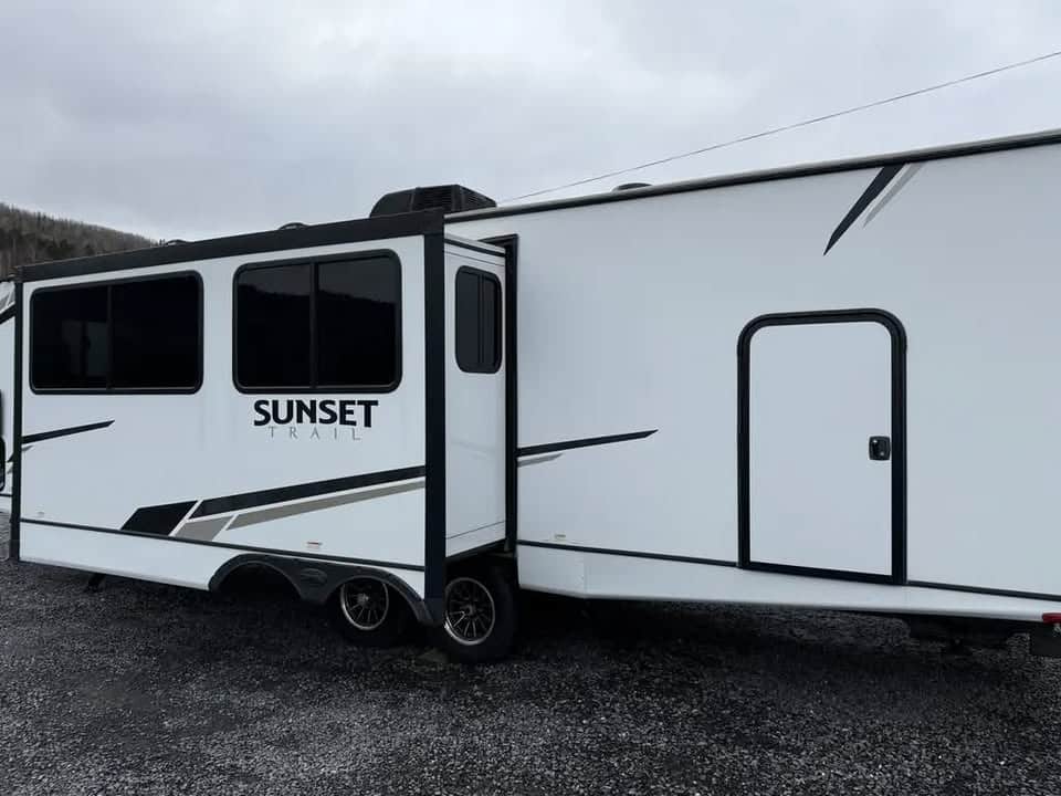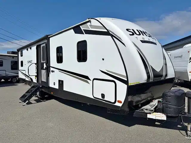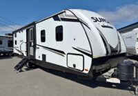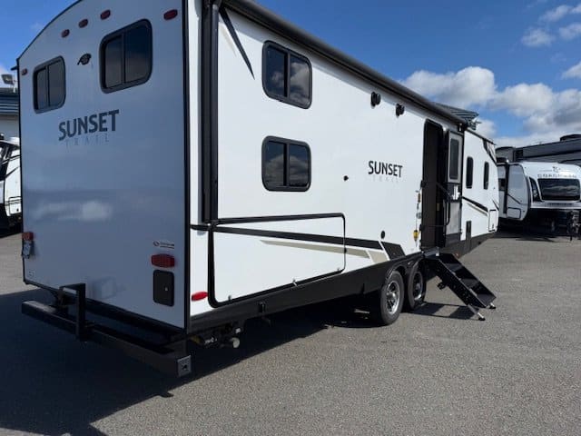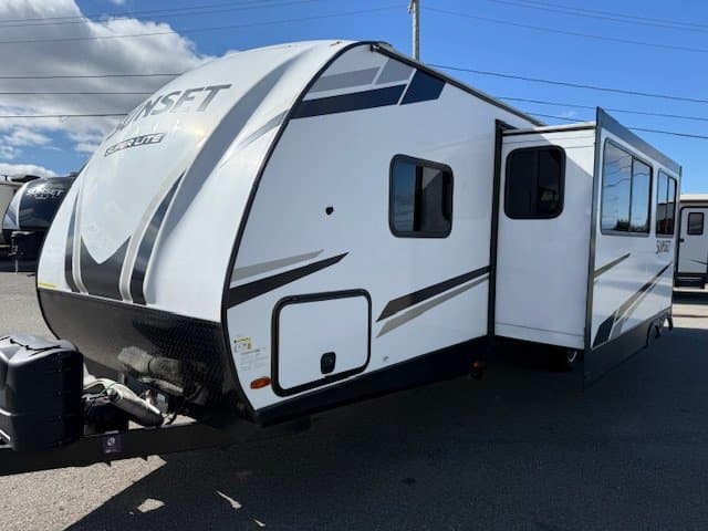 2022 Sunset 299QB, roulotte pour famille de 34 pieds à 6230 lbs avec 2 essieux, extérieur en fibre et 1 extension.